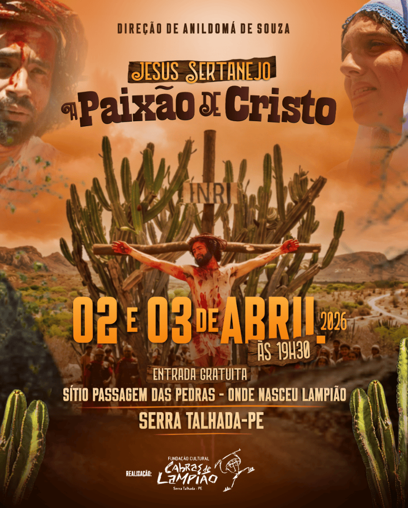 Nos dias 2 e 3 de abril de 2026, o público poderá assistir ao espetáculo teatral ao ar livre JESUS SERTANEJO – A PAIXÃO DE CRISTO, apresentado no próprio local onde nasceu Lampião, em uma experiência que une religiosidade, cultura popular e identidade sertaneja.